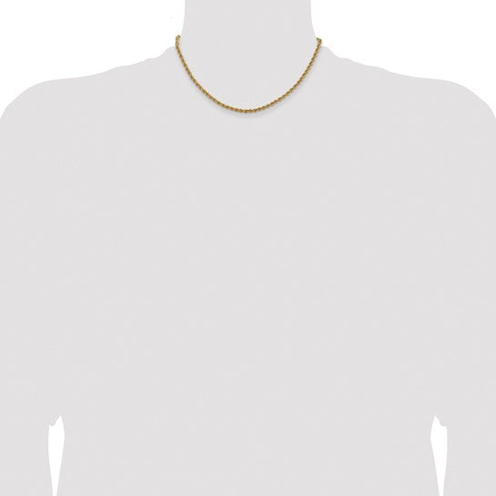 Elevate your style with our 14k Yellow Gold 2 mm Rope Chains, expertly handmade for lasting elegance. Available in multiple lengths, each solid gold chain features a secure lobster clasp and a meticulously polished finish, delivering a timeless design that complements any look. Perfectly balanced thickness ensures durability without compromising comfort. Add a touch of refined sophistication to your collection with these stunning rope chains.