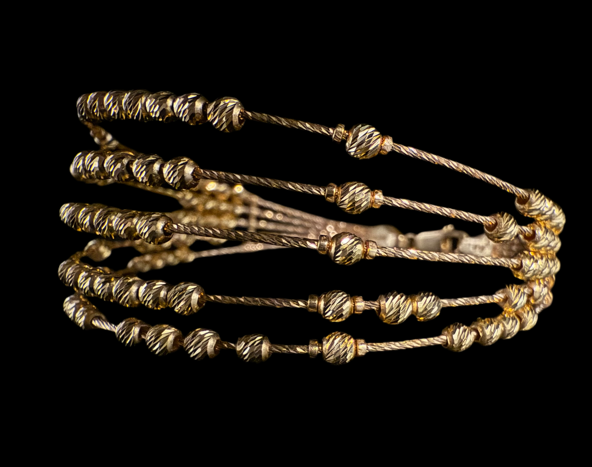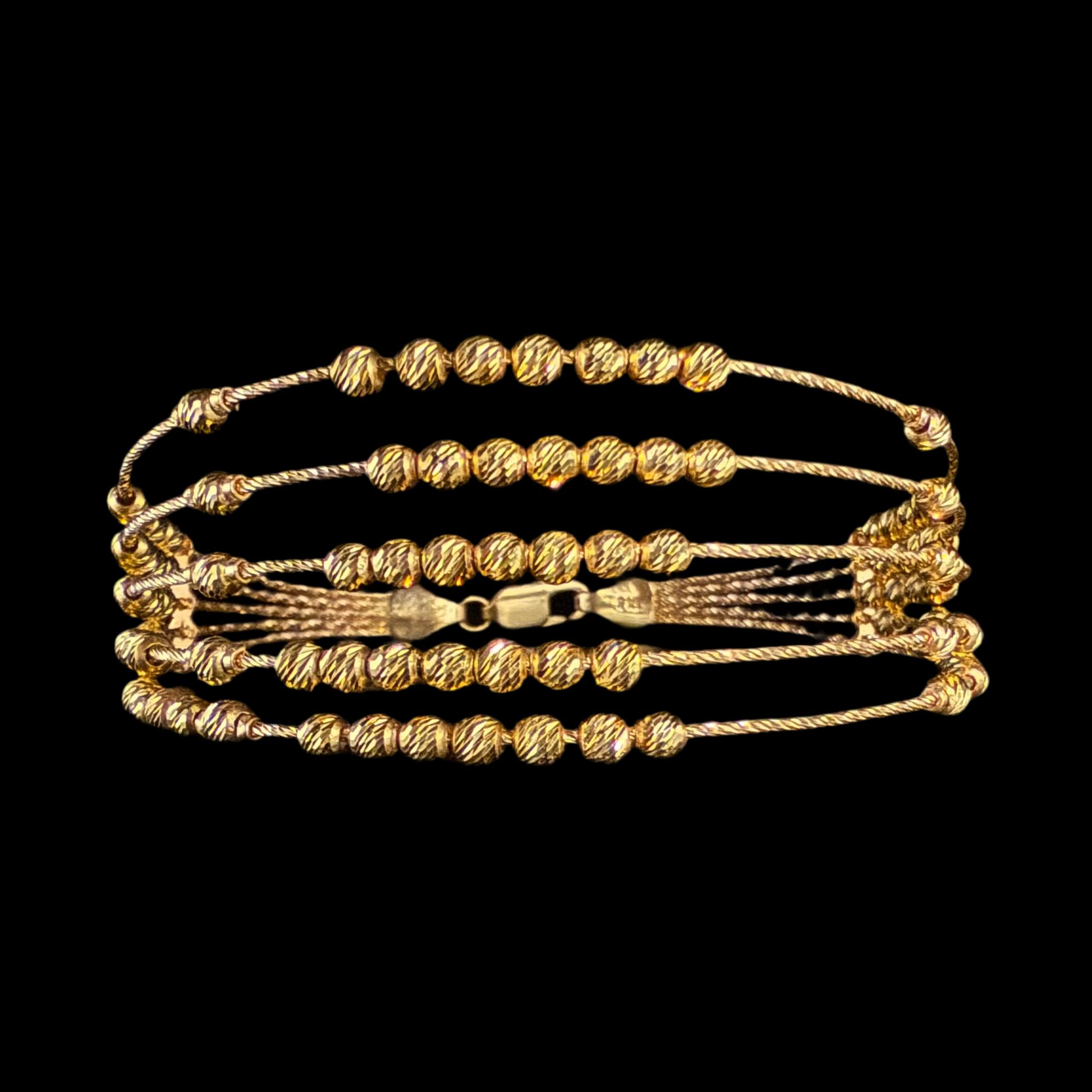 This 22k gold bracelet is an exquisite piece of jewelry. It is 5-line layered with golden balls around the wires for a stunning look. With a lobster lock for security, you can catch all the admiring glances with confidence. Grandeur and sophistication come together with a total weight of 17.5g. Be sure to make a fashion statement with this beautiful bracelet!