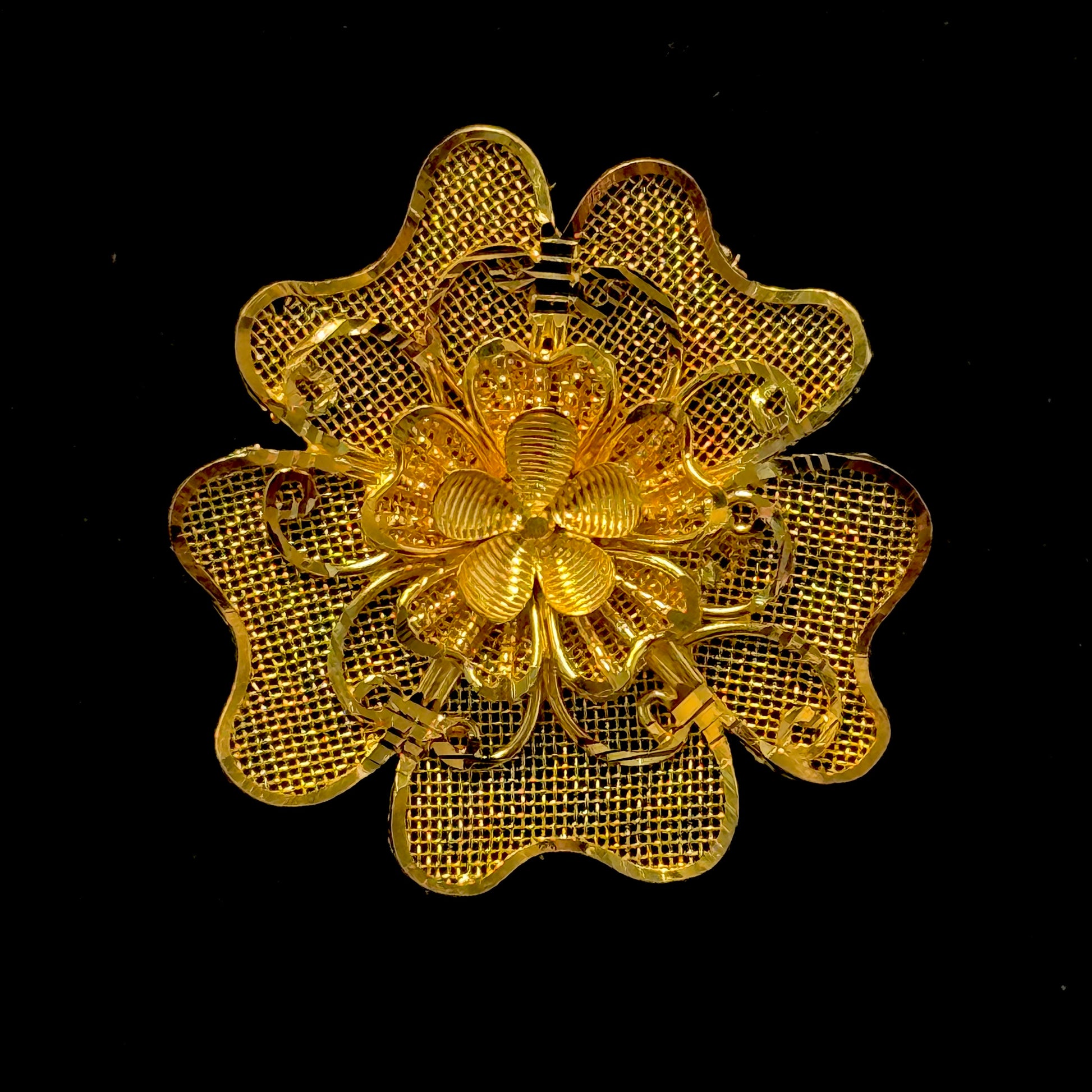 This Adjustable Grand Flower Ring is a stunning statement piece. Crafted with 22k gold and featuring four layers of intricate flower details, this adjustable ring adjusts to fit from US size 3 to US size 13. Make a bold statement with this beautiful flower ring.