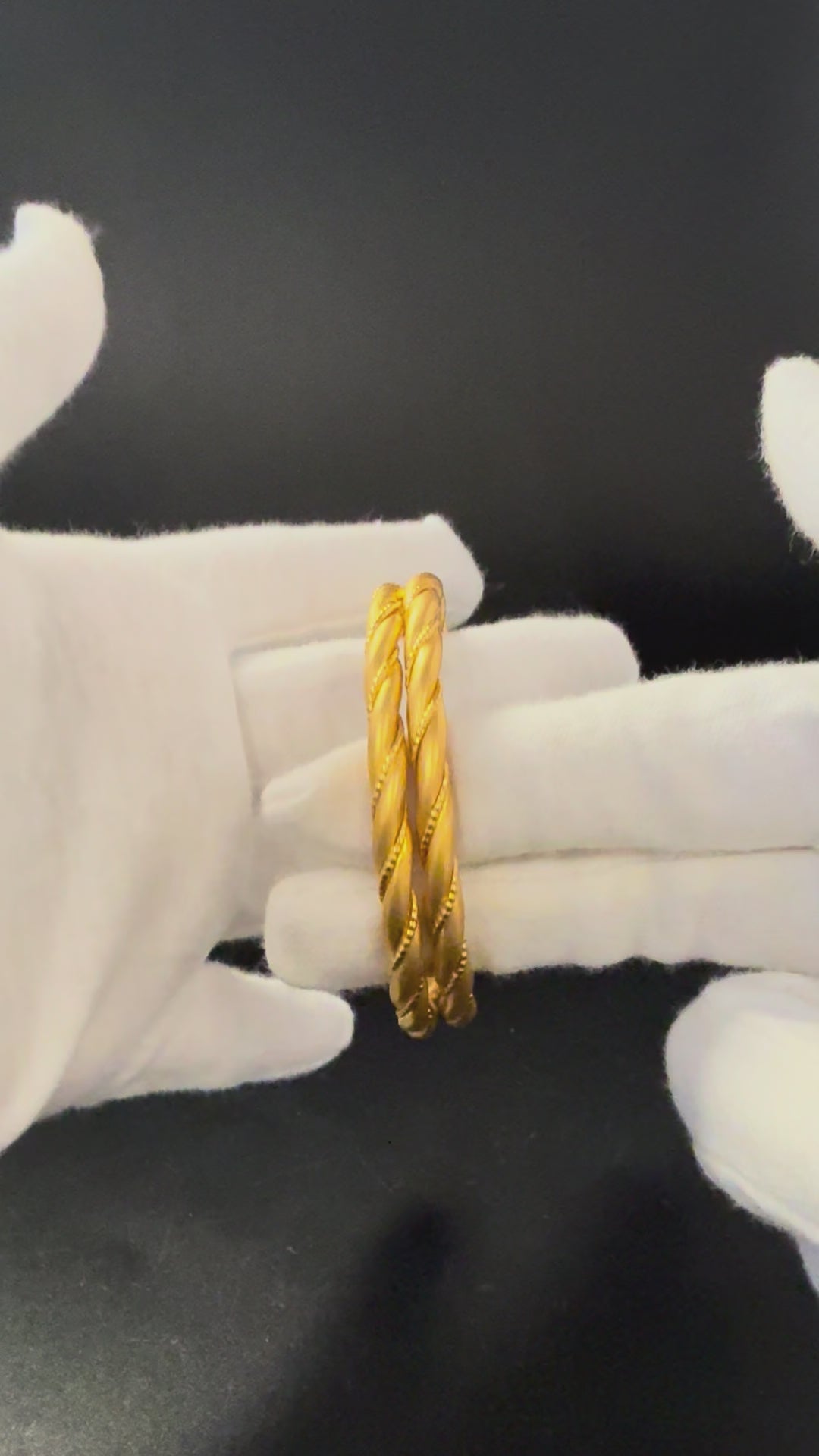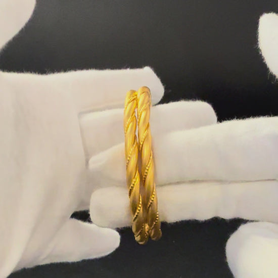 Elevate your event look with this refined set of two 22k gold bangles featuring an elegant twisted rope design that wraps gracefully around the perimeter. The intricate detailing catches light beautifully, while the lustrous polish and radiant shine showcase the quality craftsmanship behind each piece. Designed with comfort in mind, these bangles sit perfectly on the wrist for all-day wear without irritation. Whether you're attending a wedding, festival, or special celebration, this sophisticated duo adds just the right touch of golden glamour to complete your ensemble with understated luxury.
