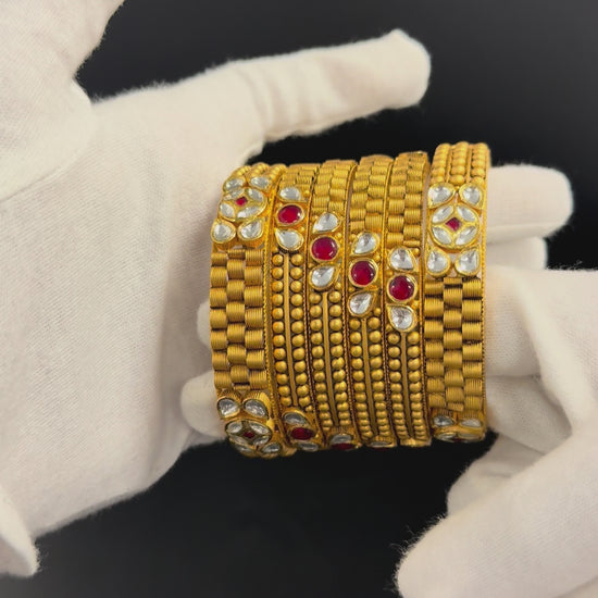 Our antique bangles are the perfect accessory for a bride on her special day. The smoky gold color along with the elegant work and colored stones make a perfect traditional look for a bride to shine on her special day. To customize further, consider pairing these bangles with our antique necklace collection to look and feel your best for your special day!