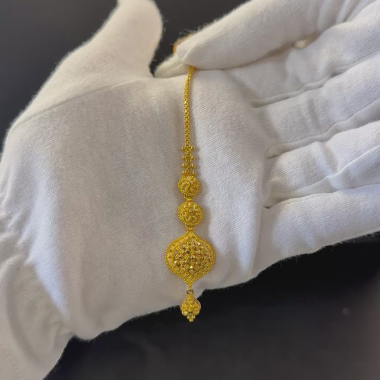 Embody elegance and tradition with our Precious & Pristine Gold Tikka! Made of 22k gold, its dome shape and two complementing flowers add a touch of sophistication. The pear shaped flower at the bottom adds a delicate detail. Elevate your look with this timeless piece.