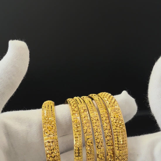 Elevate your jewelry collection with this exquisite 22k gold bangle set, featuring an intricate leaf pattern that captures timeless elegance. Each piece showcases masterful handcrafted artistry with delicate, detailed embellishments that speak to superior craftsmanship. Sized at 2.10 with a comfort-fit interior, these bangles offer both stunning visual appeal and all-day wearability. Perfect for special occasions or everyday luxury, this set combines traditional design with refined sophistication that complements any wardrobe.
