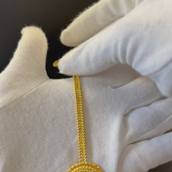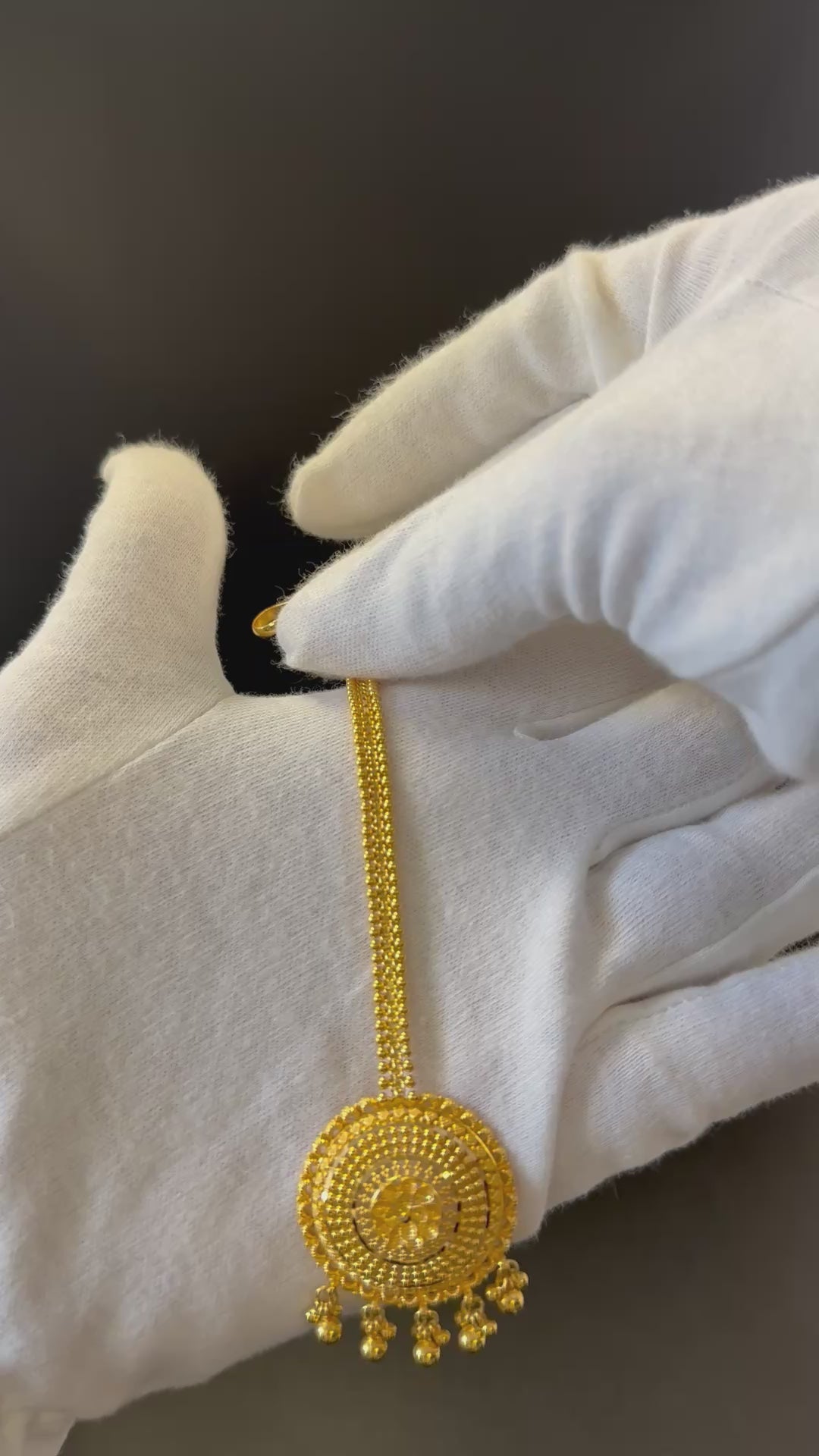 Add an elegant touch to your outfit with our 22k gold round tikka, featuring a delicate flower in the center and beautiful ghungroos dangling below. Perfect for weddings, parties, or any special occasion. Elevate your style today!