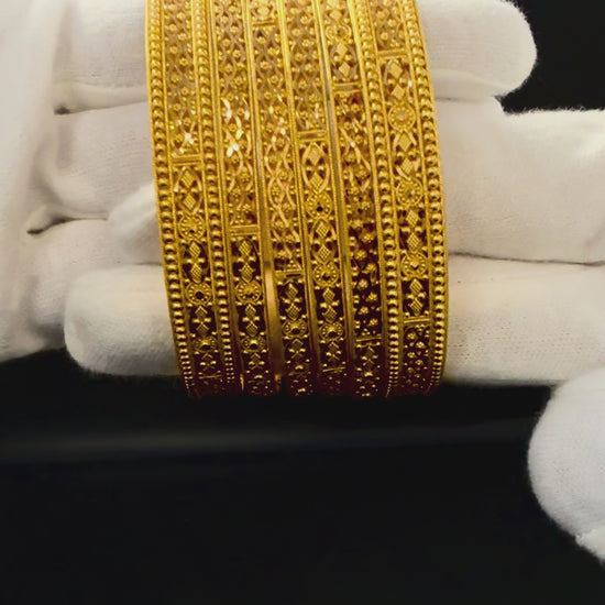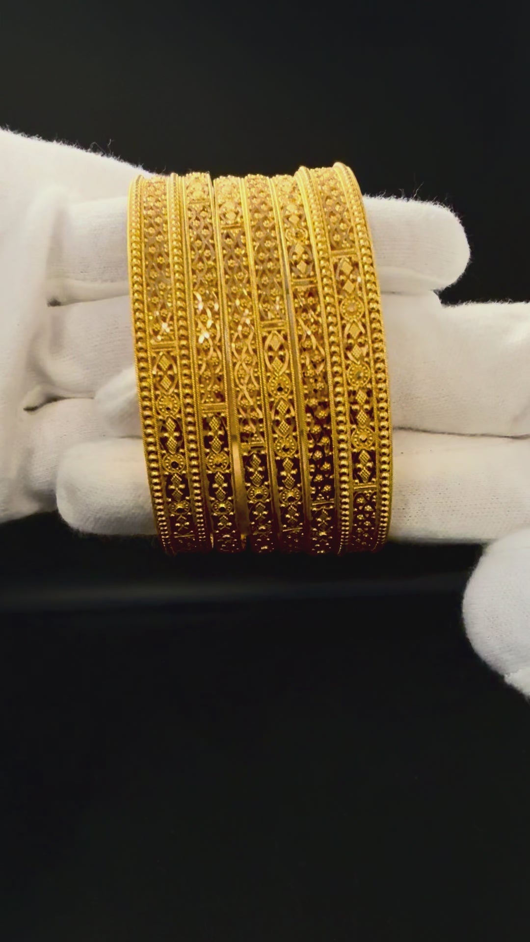 Indulge in luxury with this exquisite set of six 22k gold bangles that seamlessly blend timeless design with contemporary appeal. The perimeter showcases an enchanting interplay of diamond and circular motifs that alternate with thoughtfully crafted patterns, creating visual rhythm and sophistication. Sized at 2.8 with a comfort-fit interior, these bangles deliver all-day wearability without sacrificing elegance. Whether you're layering for impact or wearing individually, this versatile collection offers the perfect finishing touch for any occasion, from intimate gatherings to grand celebrations.