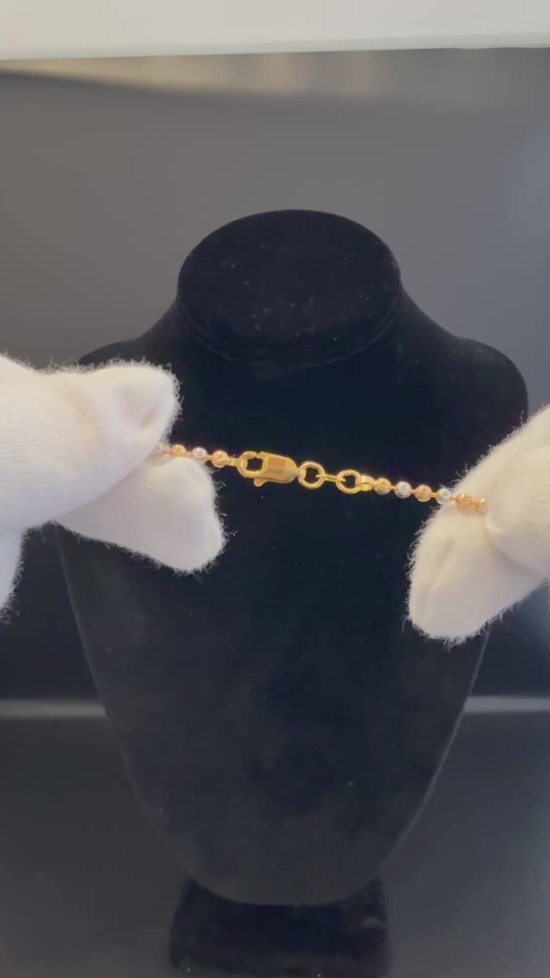 Discover timeless elegance with our Two-Tone Gold Ball Chain. Alternating 22k gold balls and rhodium-plated gold balls create a stunning contrast. The lobster lock ensures secure closure. Available in 20 inches and varying weights for the perfect fit. Elevate your style with this gold and silver colored fusion.